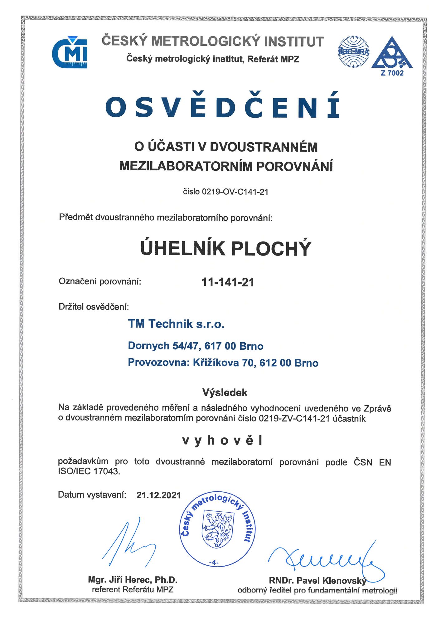 Naše akreditovaná kalibrační laboratoř se zúčastnila mezilaboratorního porovnání v oboru rovinný úhel. Dodaný úhelník jsme zkalibrovali a kalibrační list společně s tabulkou s výsledky měření zaslali zpět k odbornému posouzení. Hodnocení výsledků měření se provádí dle dokumentu ČSN EN ISO/IEC 17043:2010 Posuzování shody.