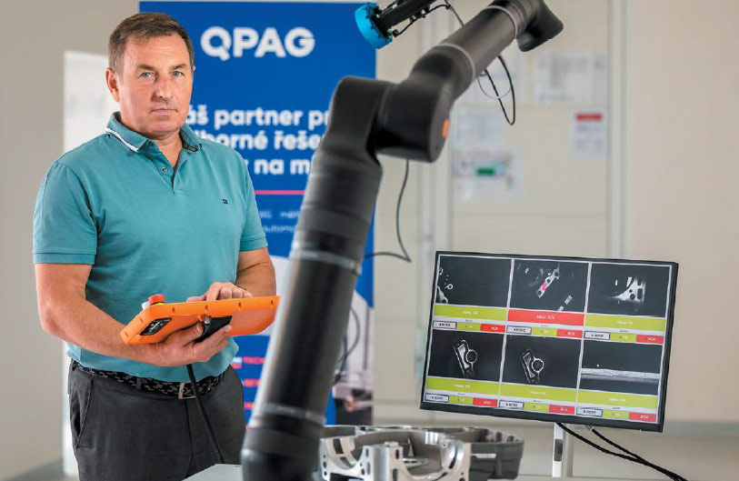 Společnost QPAG má zkušenosti s kontrolou kvality více než 20 let a nabízí služby počínající manuální vizuální kontrolou, kterou jsme popsali výše, až po návrh a zprovoznění nejmodernějších systémů s umělou inteligencí. Petr Koutný je jednatelem QPAG Digital a v letošním roce prohloubil spolupráci s Bosch Rexroth při tvorbě takřka dokonalého automatického kontrolního pracoviště. „Poměrně dlouho jsem hledal vhodný kolaborativní robot, který by nesl náš vision systém a spolehlivě dokázal pracovat ve třech směnách. Kobotů je na trhu hodně, ale jejich kvalita se liší. Padl mi do oka kobot Kassow, který splňuje nejvyšší průmyslové standardy a v základu je vybavený sedmi osami. Neuvěřitelnou shodou okolností právě ve chvíli, kdy jsem zjišťoval pozadí firmy a možnosti spolupráce s Kassow Robots, mě kontaktoval pan Bedřich Dittrich z Bosch Rexroth, zda bych měl chuť podívat se na novou akvizici v jejich portfoliu: dánskou firmu Kassow Robots,“ vypráví pan Koutný. Bosch Rexroth je celosvětově působící dodavatel průmyslových komponentů pro jednoúčelové stroje a s firmou QPAG spolupracuje od samého počátku.
