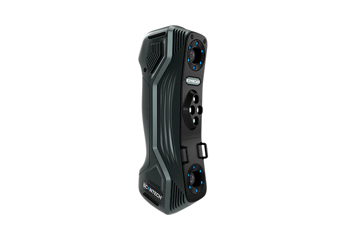 Scantech SIMSCAN je profesionální ruční 3D laserový skener, navržený pro vysoce přesné, rychlé a flexibilní skenování i v těžko přístupných místech. Díky kompaktní konstrukci (pouhých 570 g) a odolnému kovovému tělu představuje ideální nástroj pro průmyslové aplikace, kde je nutné získat kvalitní 3D data přímo na místě – od výroby a kontroly kvality až po reverzní inženýrství.